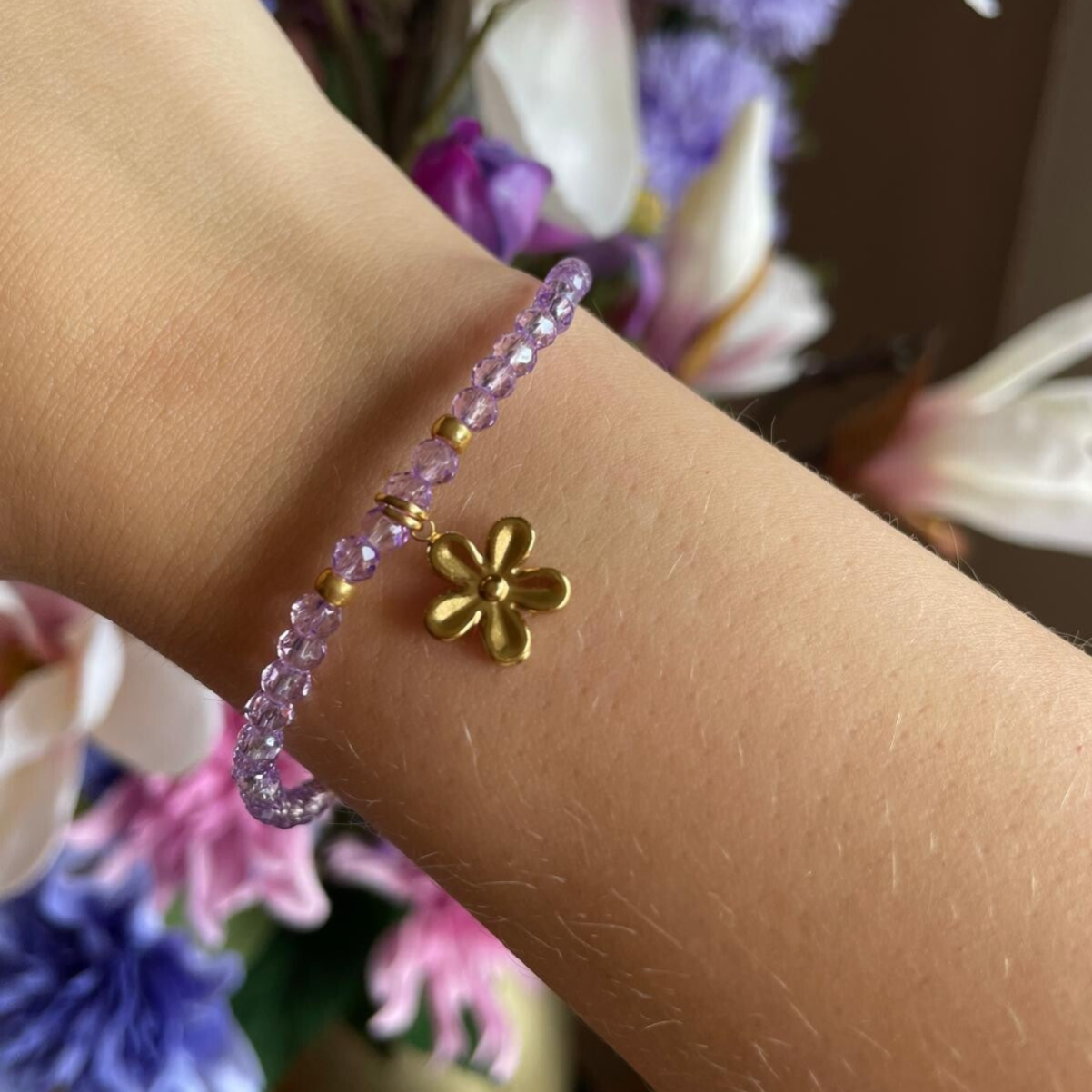Hoe leuk is deze paarse elastieken kralenarmband! Dankzij het elastiek past hij altijd en is hij super comfortabel om te dragen. Je kunt kiezen uit een bloem- of hartjesbedel, waardoor hij helemaal bij jouw stijl past.
