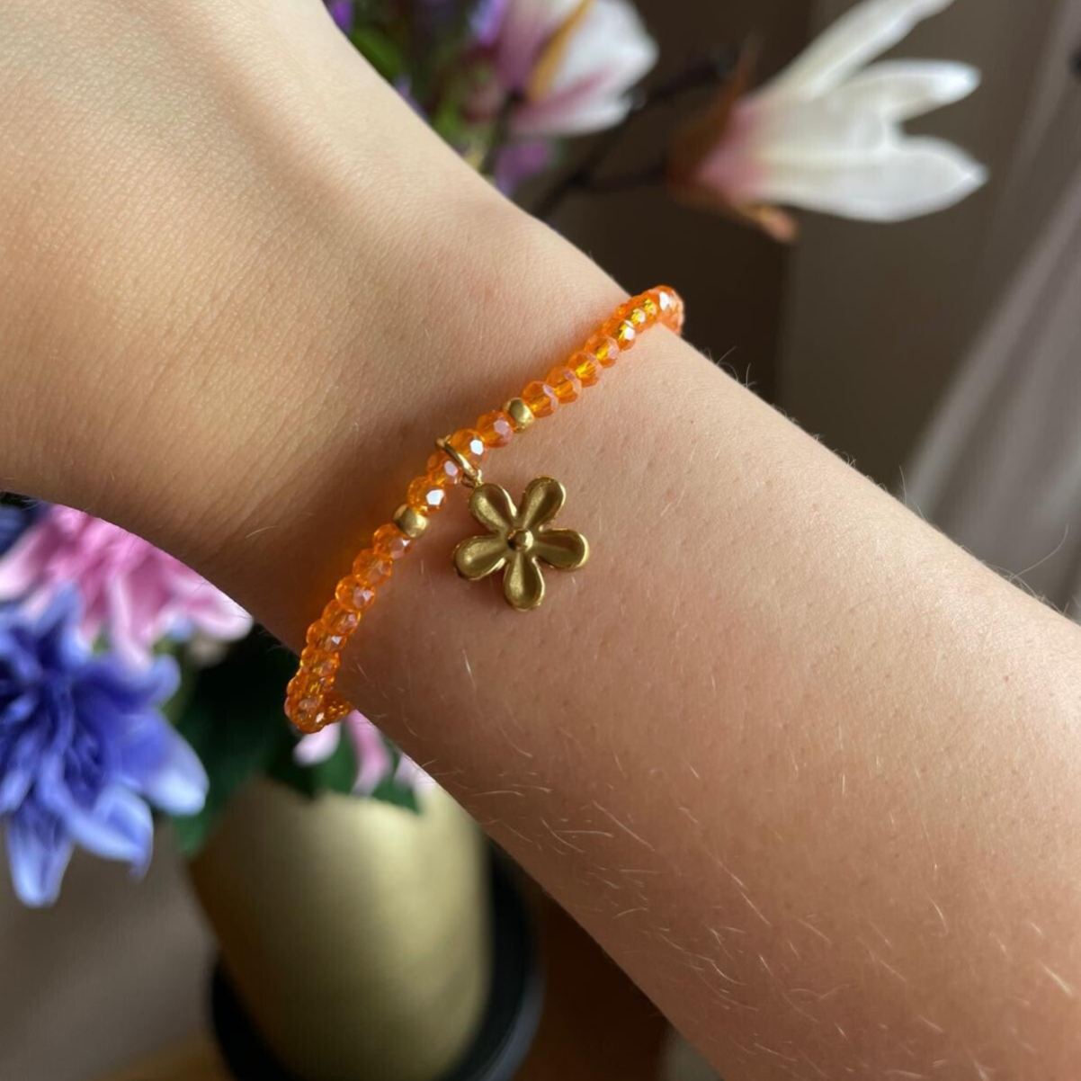 Hoe leuk is deze oranje elastieken kralenarmband! Dankzij het elastiek past hij altijd en is hij super comfortabel om te dragen. Je kunt kiezen uit een bloem- of hartjesbedel, waardoor hij helemaal bij jouw stijl past.