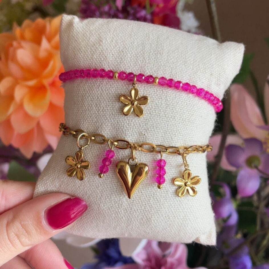 Hoe leuk is deze bedelarmband! Perfect te combineren met andere armbanden, zoals onze Pink Shiny Armband. De bedelarmband is geheel verstelbaar naar jouw pols, zodat hij gegarandeerd comfortabel zit.