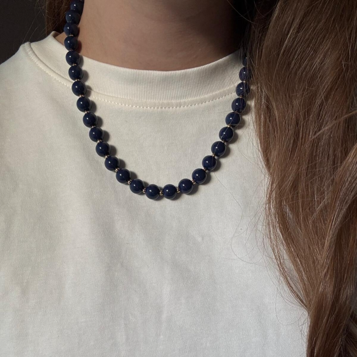 Deze donkerblauwe kralenketting van Acryl is een echte herfst must-have. De ketting is licht van gewicht en ideaal bij jou herfst outfits. De glanzende acrylkralen in combinatie met de subtiele gouden accenten geven de ketting een speels, maar chique uitstraling. Je kan hem leuk los dragen of layeren met een langere ketting!