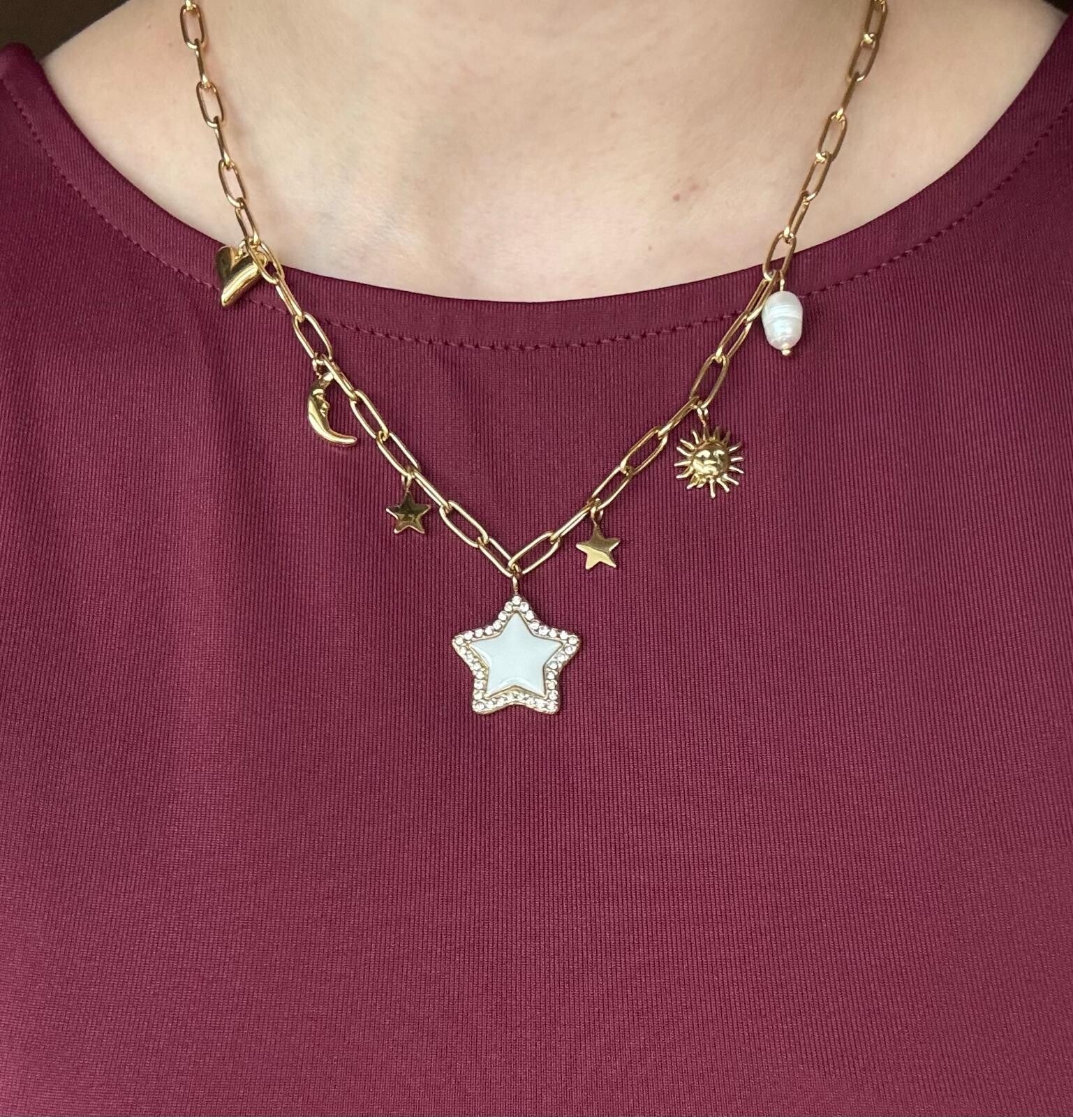 Ben helemaal kerst-ready met onze White Star Bedelketting! Combineer hem met onze Falling in Love Ketting voor een eye-catcher look! De kleine, subtiele bedeltjes zorgen voor een klassieke look, waardoor je de gouden ketting ook los kan dragen. De bedelketting verkleurt niet, dit komt door het roestvrijstalen materiaal. Zo kan je ook na kerst genieten van deze feestelijke bedelketting.